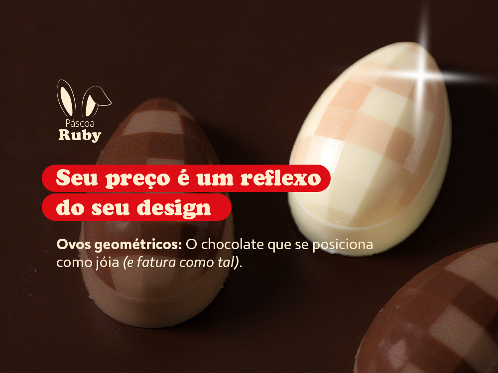 Apostar na geometria é um movimento de posicionamento premium. Linhas retas e acabamentos lapidados elevam o chocolate ao status de joia, tirando sua marca da guerra de preços e colocando-a no terreno do valor.